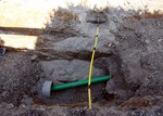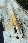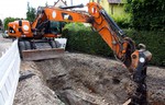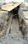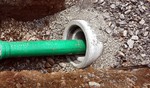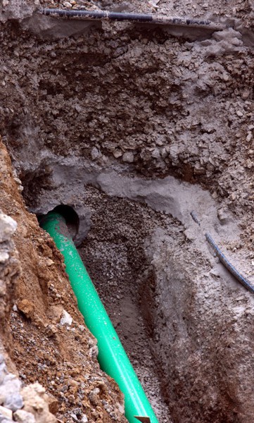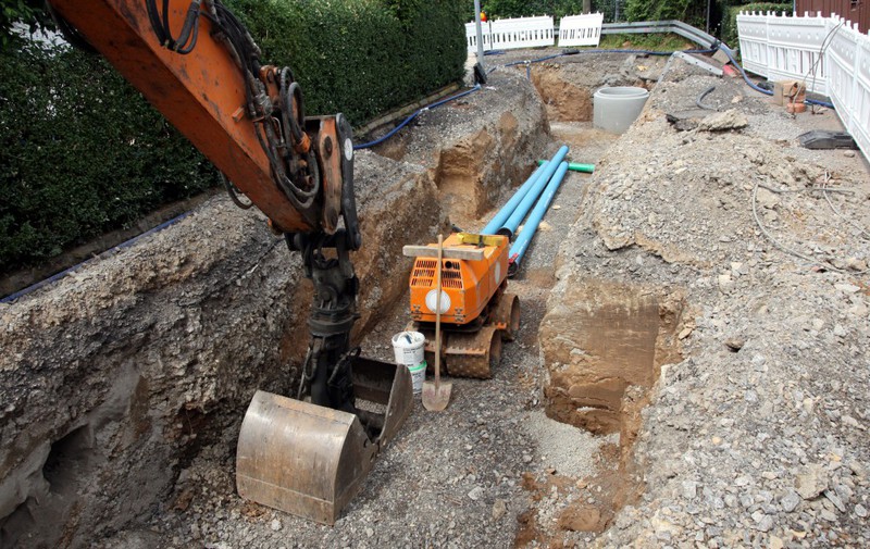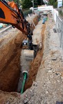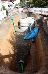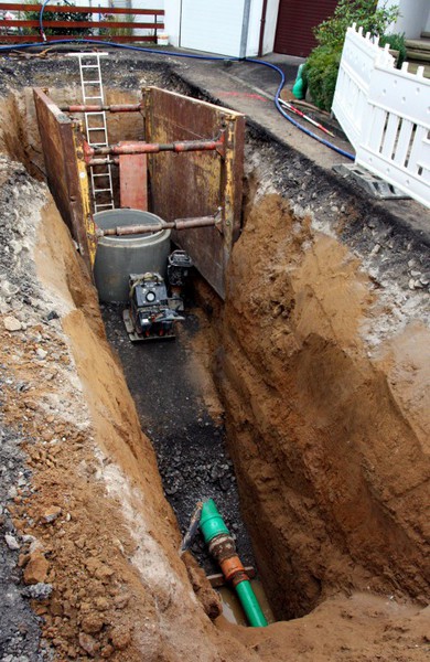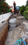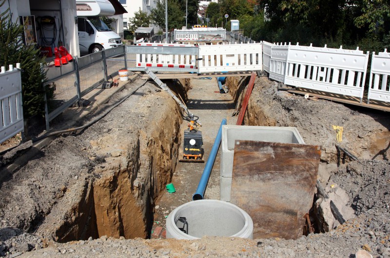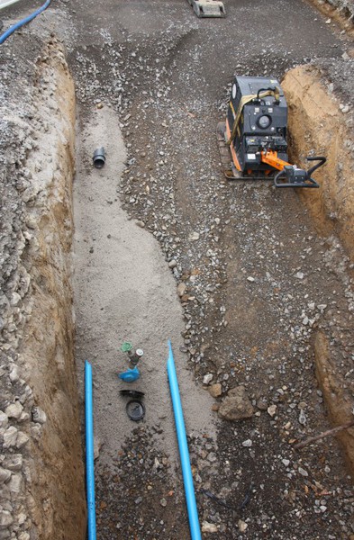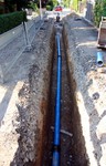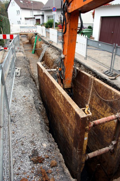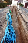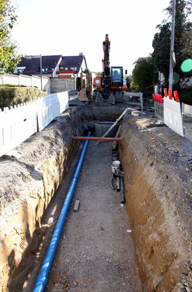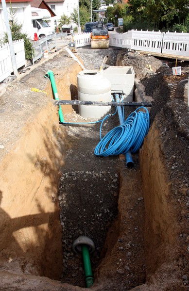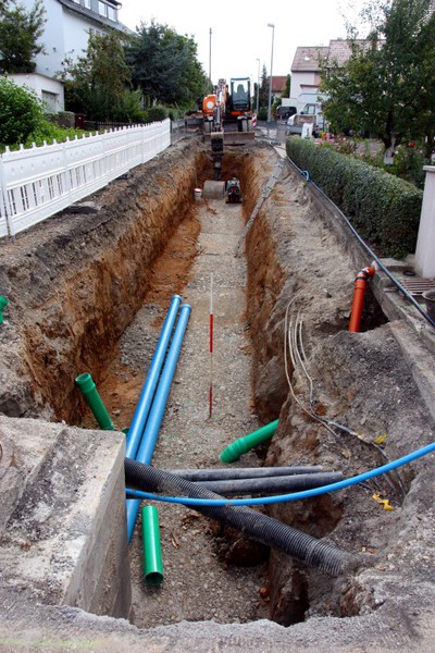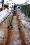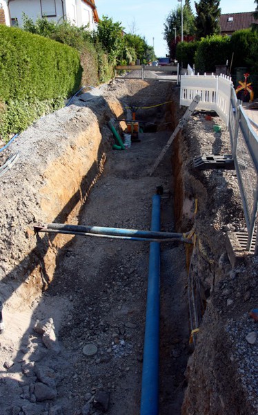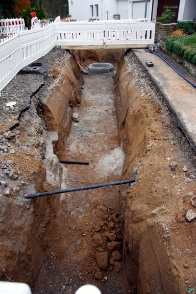 Der Baugraben ist vorne an der Straße angekommen. Das Rohr zum Anschließen liegt bereit.