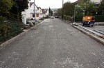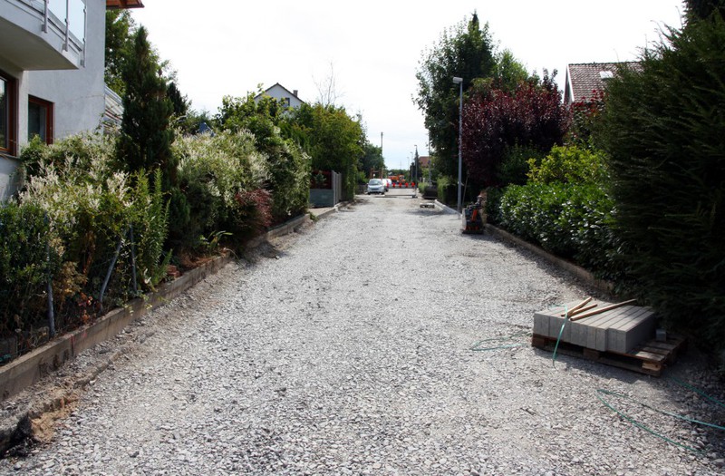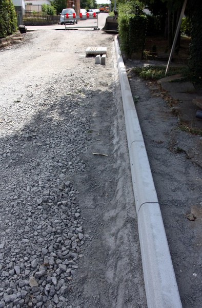 Die Gräben sind zu und seitlich werden Randsteine gesetzt. So die letzten Arbeiten vor den Bauferien.