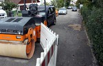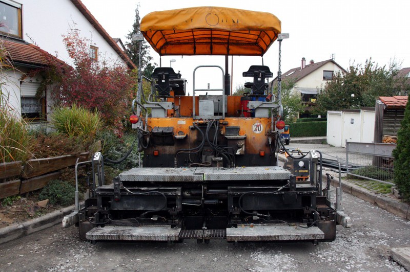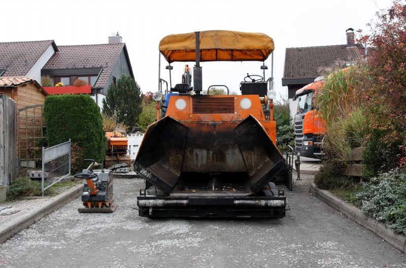 Der zweite Bauabschnitt steht vor seinem Ende. Die Asphaltmaschine steht bereit.