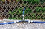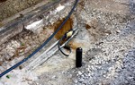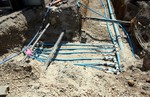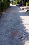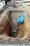 Die lange Baugrube von letzter Woche ist Großteils zugeschüttet. Das Verteilerventil der Wasserleitung ist in den Schacht eingebaut. Sonst sieht man so was ja eher selten.