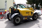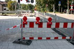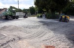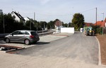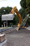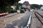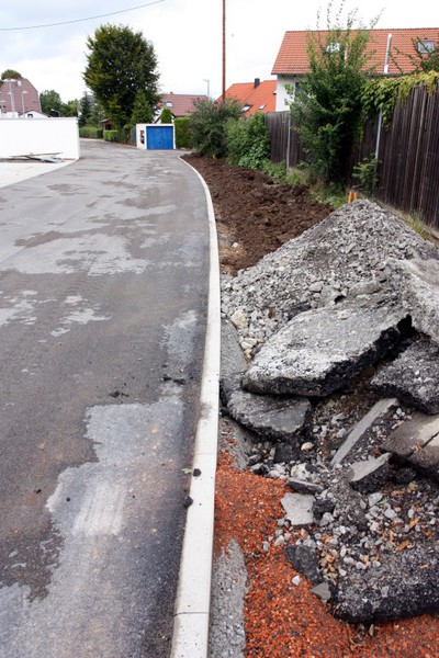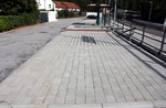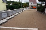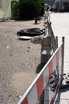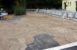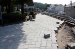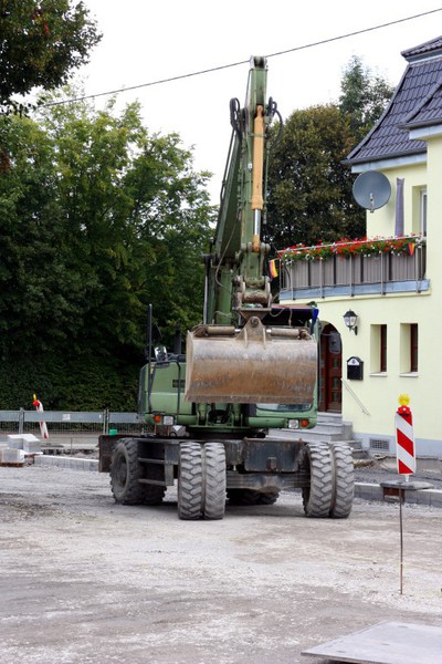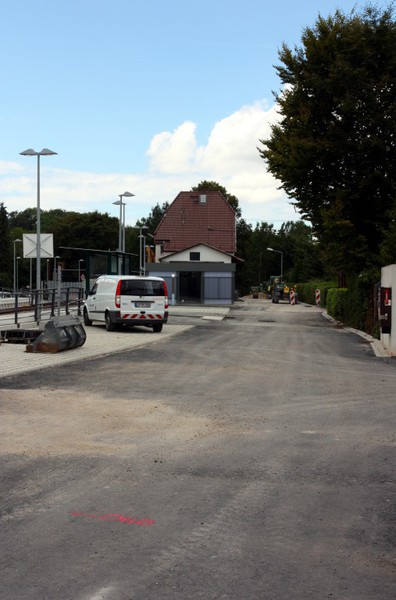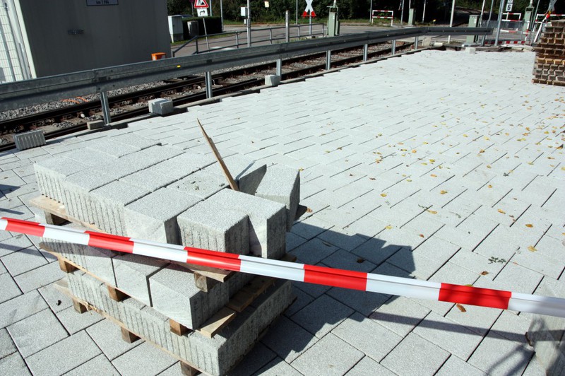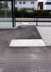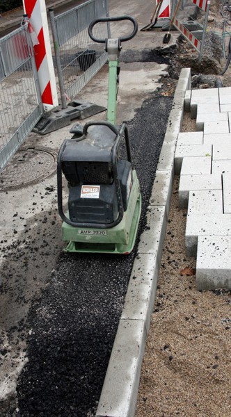 Es geht weiter an der Buswendeplatte. Auf der vorderen Seite ist man beinahe schon fertig. Eine technische Hintergrundinformation: Die Asphaltschicht unter dem Betonpflaster besteht aus einem speziellen wasserdurchlässigen Asphalt. Damit ist gewährleistet, dass bsw. Regenwasser ins Erdreich einsickern kann.