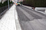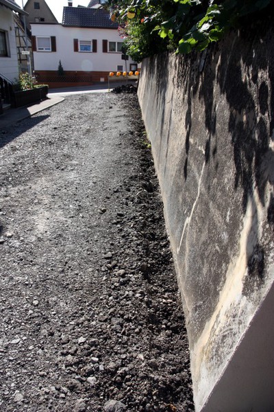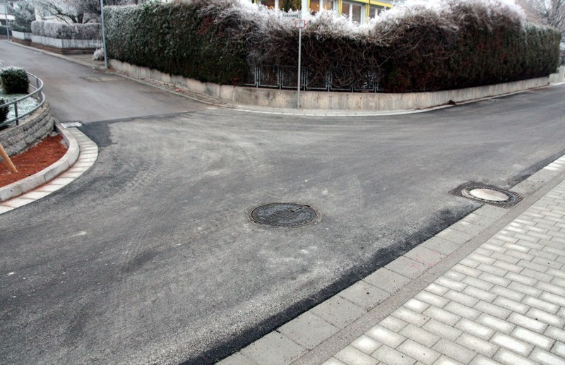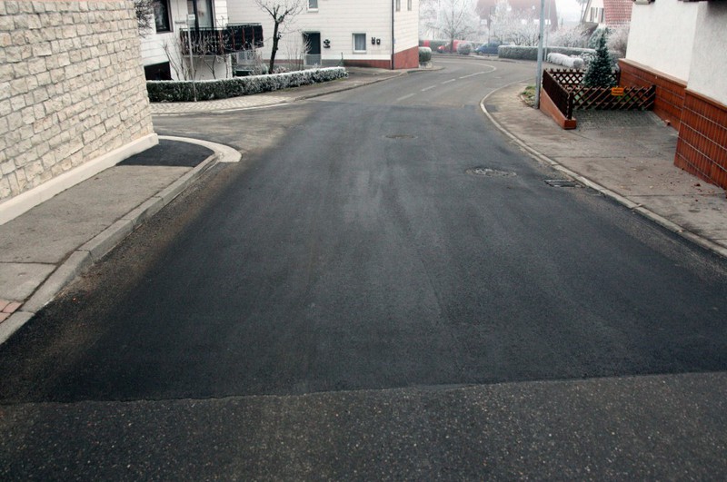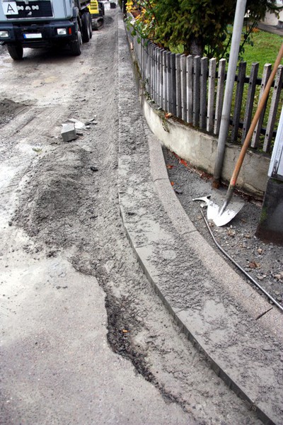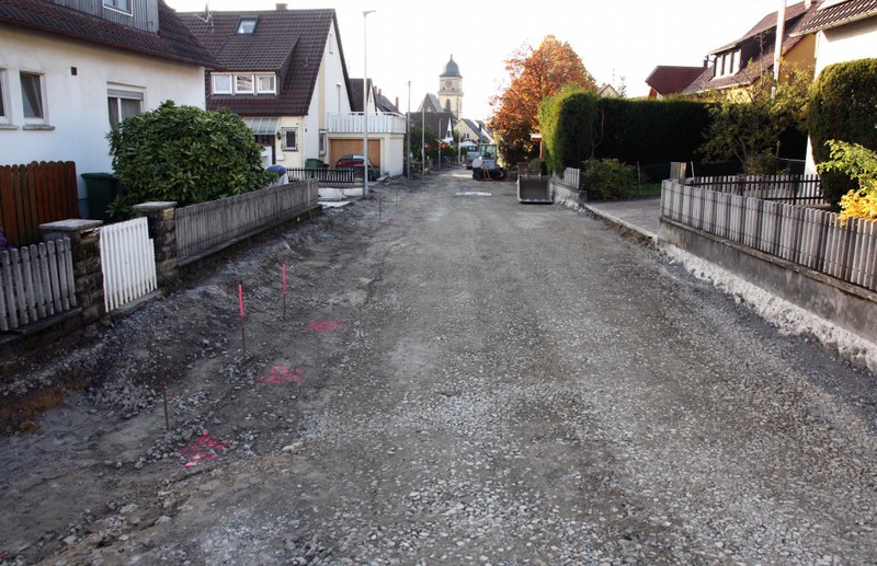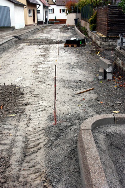 Straße bis in die Häuser erneuert. Nach Abschluss der Tiefbauarbeiten erfolgt der Ausbau der Straße. Straßenunterbau, Beläge, und Gehweg erfahren eine Komplettsanierung. Im Zuge der Tiefbaumaßnahme