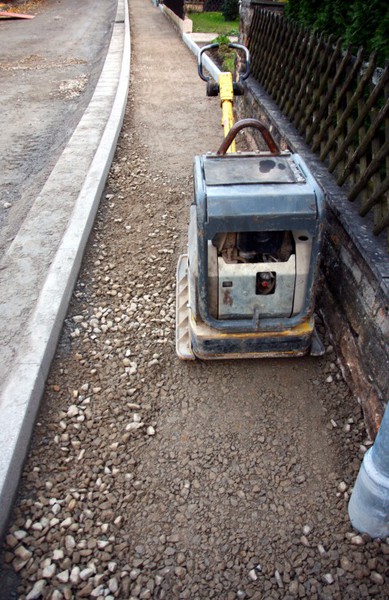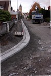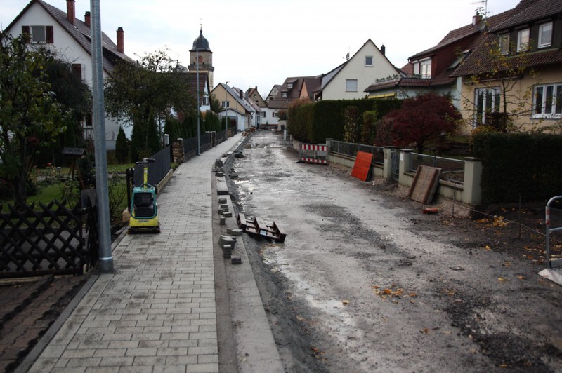Es wurden in dieser Woche die Markierungen für den neuen Gehweg gesetzt. Zudem ist die Straße gut plattgewalzt worden. Auf dem Lagerplatz liegen auch schon die Pflastersteine bereit.