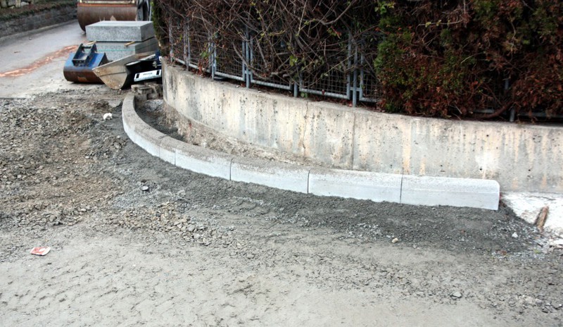 Für die Bordsteine sind Rundbordsteine vorgesehen. Damit bleiben die Bordsteine überfahrbar. Wenn man den Gehweg mit einem Pflaster versieht, ergäbe sich zudem eine optische Abgrenzung zur Fahrbahn.