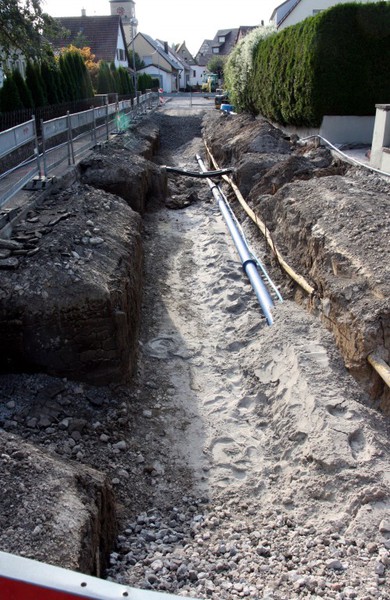 Die Hauptwasserleitung ist angeschlossen und damit die Tiefbauarbeiten nun fertig. An den Gehwegen geht es mit den Stromleitungen weiter. Es geht voran.