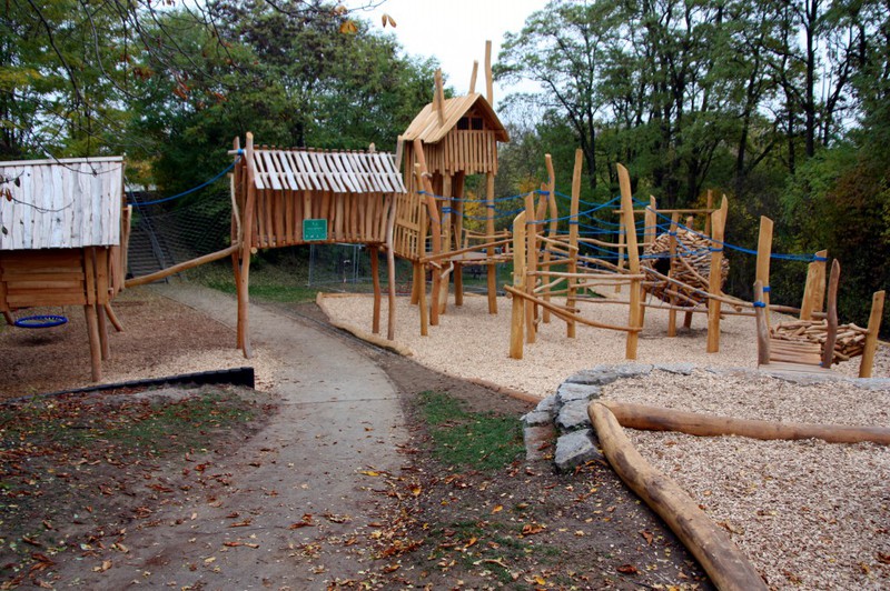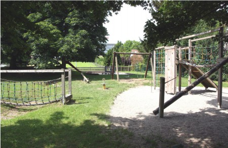 hohen Turm, ein Nest aus Robinien, mehrere Häuser, eine Himmelsschaukel, ein Brückensteg, der Erhalt der alten Rutsche. Im Scheerwiesenweg sind drei Sitzgelegenheiten geplant, ein großer