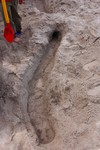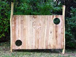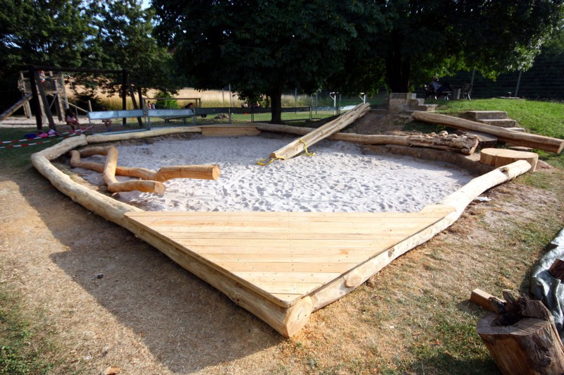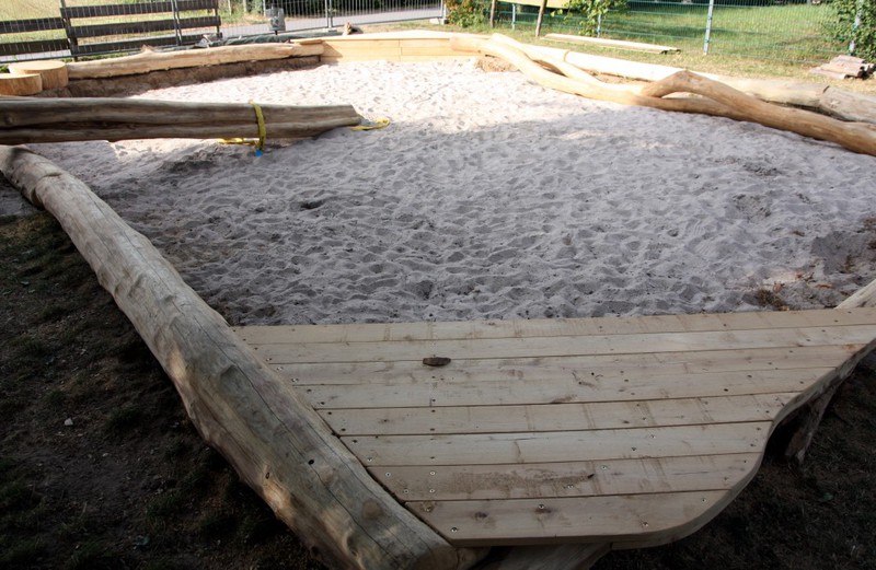 in den Sandkasten und lädt zum Spielen ein. Die Sandkasteneinfassung aus dicken Robinienstämmen kann ebenso als Sitzgelegenheit oder zum Balancieren genutzt werden.