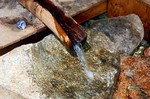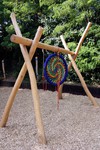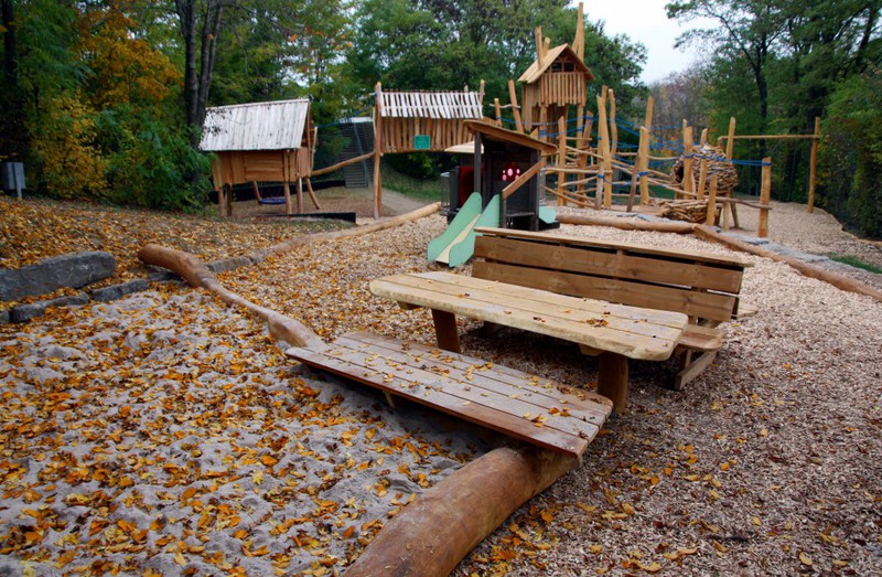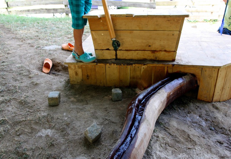 Wasser ist ein Element, das Kinder stundenlang beschäftigt und ihre Phantasie anregt. Über einen Bachlauf sowie mehrere Rinnen aus ausgehöhlten Robinienstämmen und über Wassertische rinnt hier Wasser