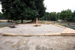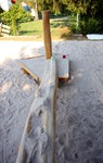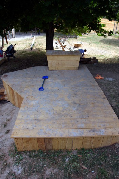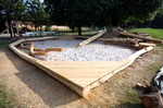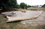 Sandspielbereich mit Einfassung aus Robinienstämmen, das Wasserspiel mit Wasserlauf und 2 "Matschtische".