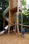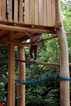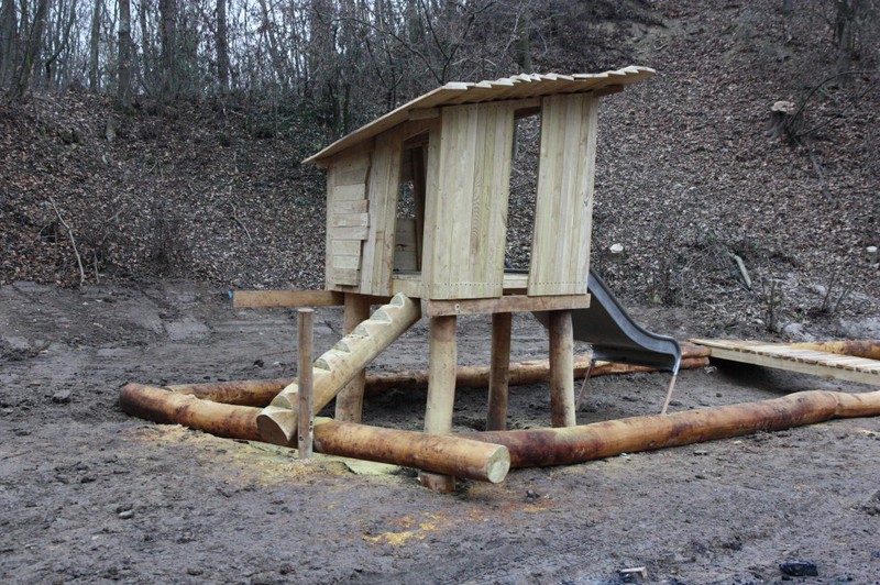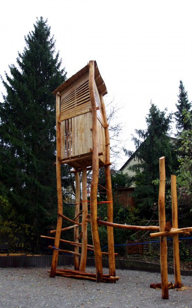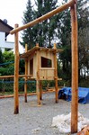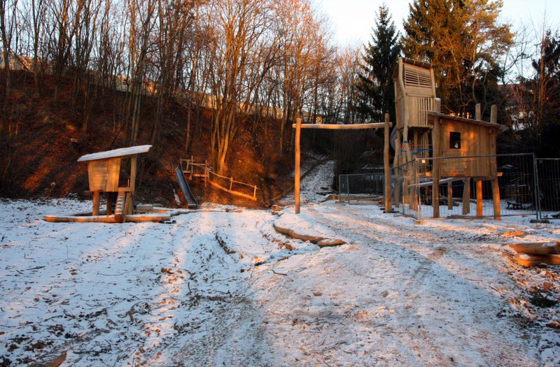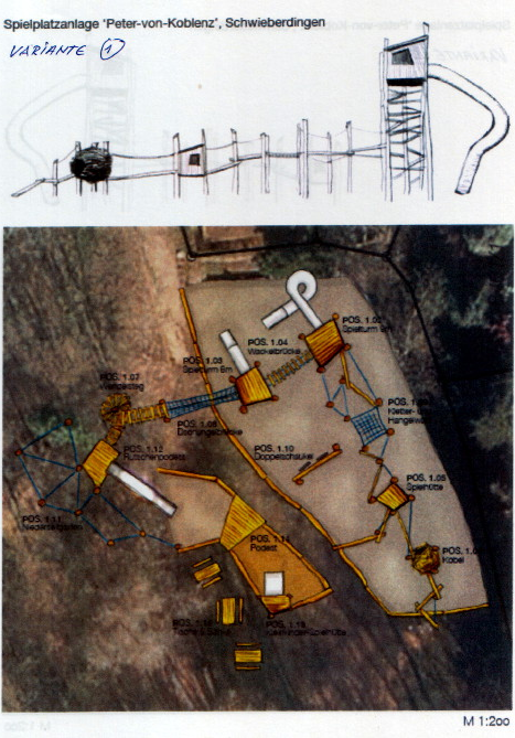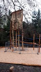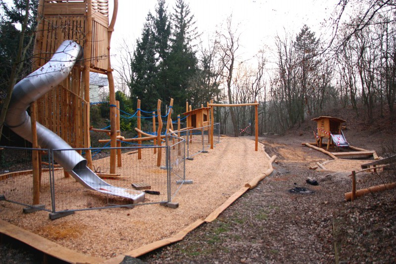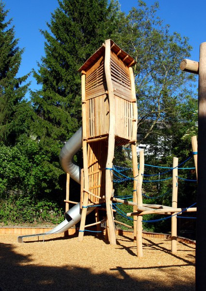 Der hohe Spielturm ist bereits gut erkennbar, auch die Spielhütte und die Konstruktion der Himmelschaukel sind in seiner Dimension und Größe ablesbar. Vom großen Turm geht es bald abwärts über eine