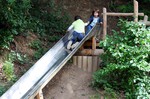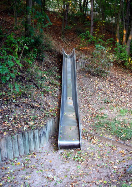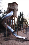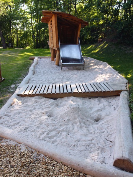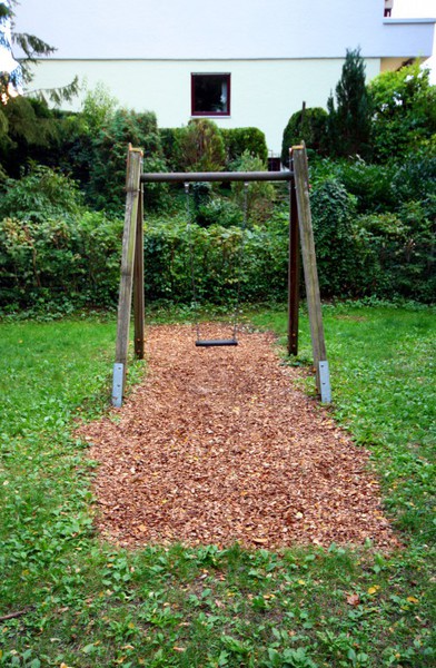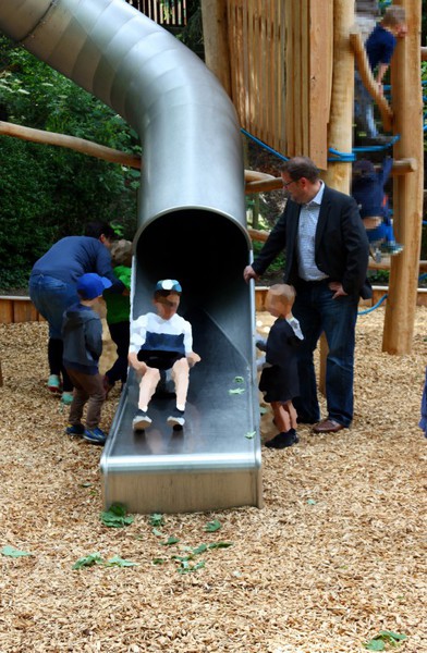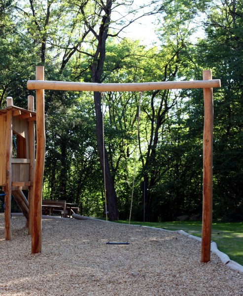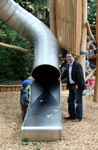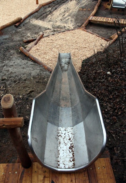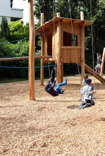 geschlossene Edelstahlrutsche direkt in den Fallschutz, der aus feinem Kies bestehen wird. Von der hohen Doppelschaukel werden die Kinder einen Überblick über das Spielgeschehen
