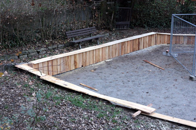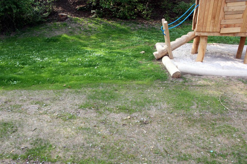 Es ist eigentlich kein Baufortschritt mehr, sondern ein Warten auf das Wachsen des Rasens. Der Bauzaun steht noch und schützt den frisch sprießenden Rasen. Der freizugängliche Teil mit dem großen Turm erfreut sich derweil schon großer Beliebtheit bei den Kindern.