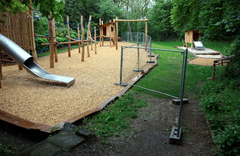 Der Spielplatz ist noch nicht freigegeben. Die Geräte und Aufbauten sind deshalb noch gesperrt.