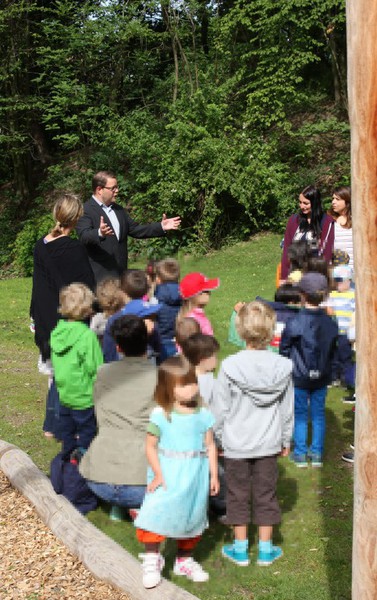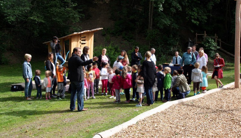 Kurz nach 9:30 Uhr fand die offizielle Eröffnung des Spielplatzes durch Bürgermeister Lauxmann statt. Zur Feier gesellten sich Kinder es KiGa Oberer Schulberg, einige
