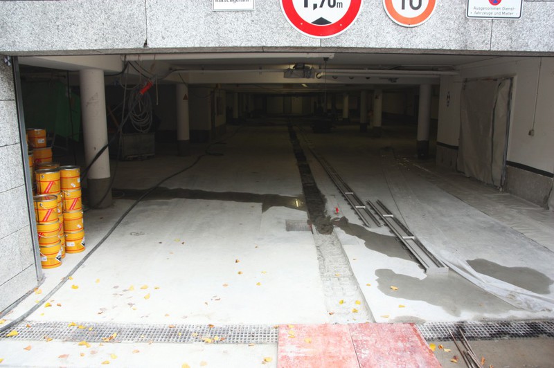 Seit 02.11 ist die obere Tiefgaragenebene wieder offen. Der Belag und die Entwässerungsrinnen sind gerichtet. Ab dem 04.11 kann man wohl auch wieder in die zweite Ebene