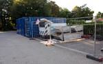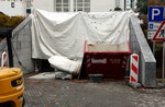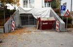 Die Plane ist unten, ein Einblick nicht möglich. Dem Geruch nach zu urteilen, wird eine Beschichtung aufgetragen.